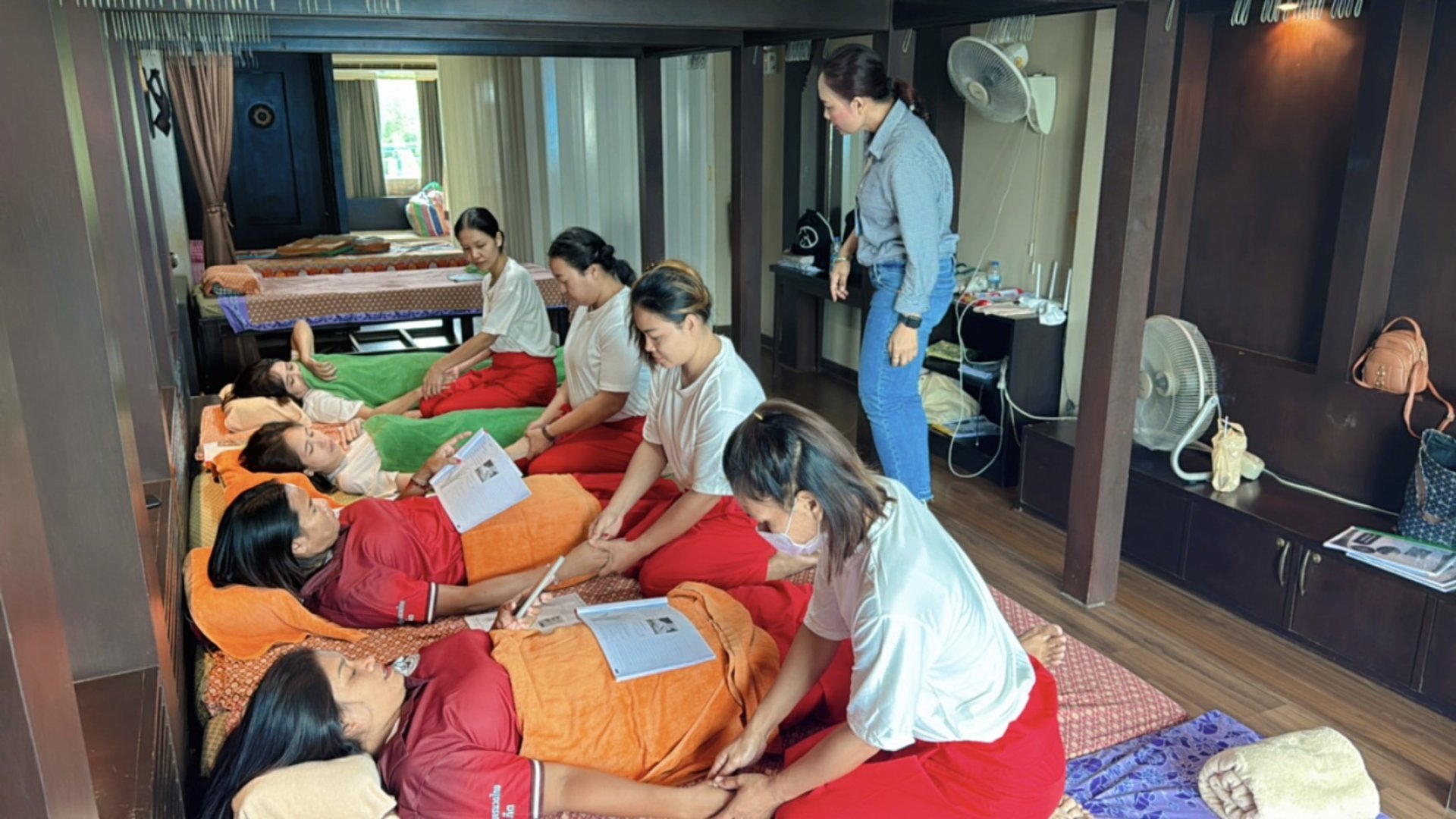 " เรียนรู้ศาสตร์การนวดไทย ทั้งทฤษฎีและปฏิบัติ เพื่อเป็นมืออาชีพในอนาคต! ทุกคนตั้งใจเรียนอย่างเต็มที่ เพราะทุกแรงบันดาลใจคือก้าวสู่เป้าหมายของเรา " "Learning the art of Thai massage, both theory and practice, to become professionals in the future! Everyone is putting in their best effort because every inspiration is a step toward our goals. "